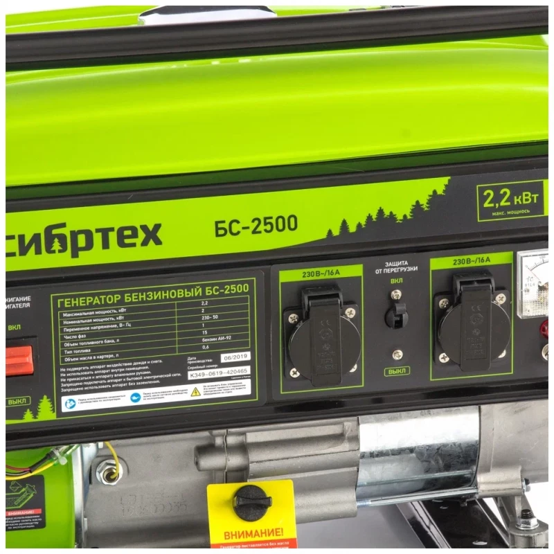 Генератор бензиновый БС-2500, 2.2 кВт, 230В, четырехтактный, 15 л, ручной стартер Сибртех