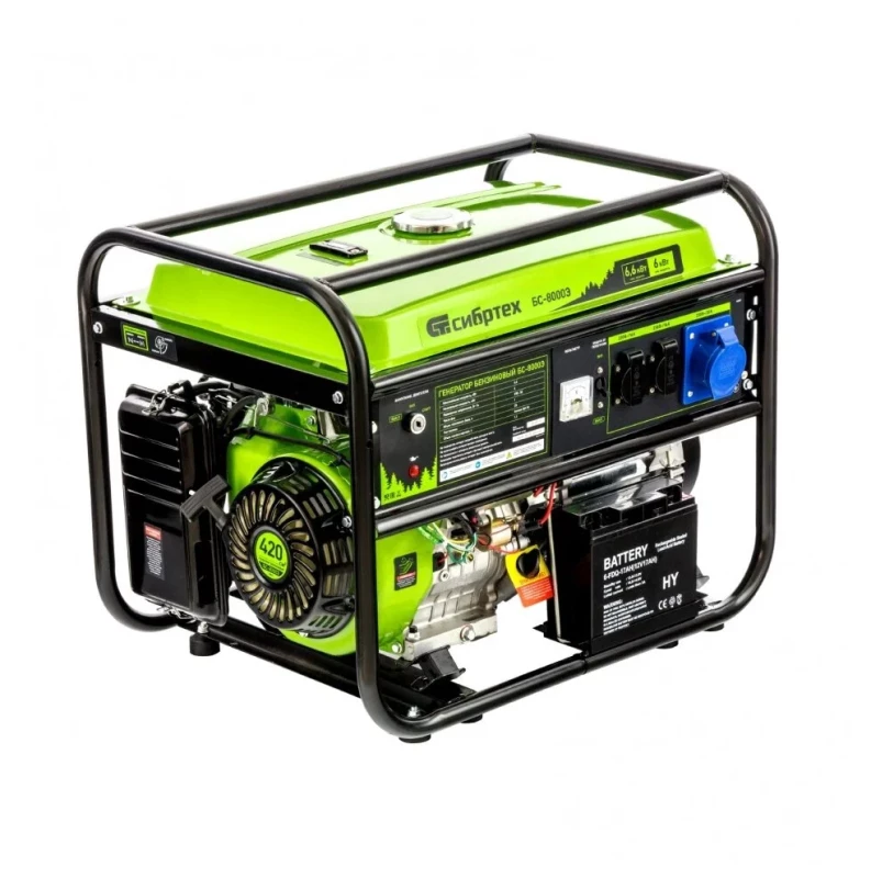 Купить инструмент Генератор бензиновый БС-8000Э, 6,6 кВт, 230В, четырехтактный, 25 л, электростартер Сибртех в Кемерово по цене 51790 рублей. Смотрите другие 82 товаров в разделе Электростанции бензиновые по ценам от 7243 до 363390 рублей. Родительская категория - Силовое оборудование. Производитель - Сибртех.