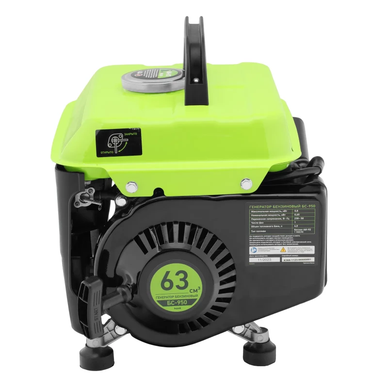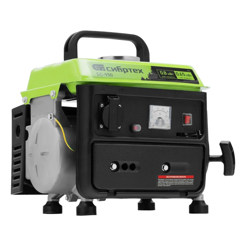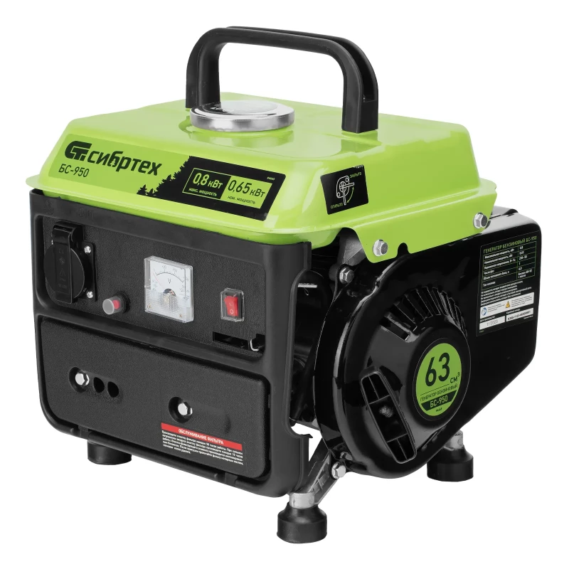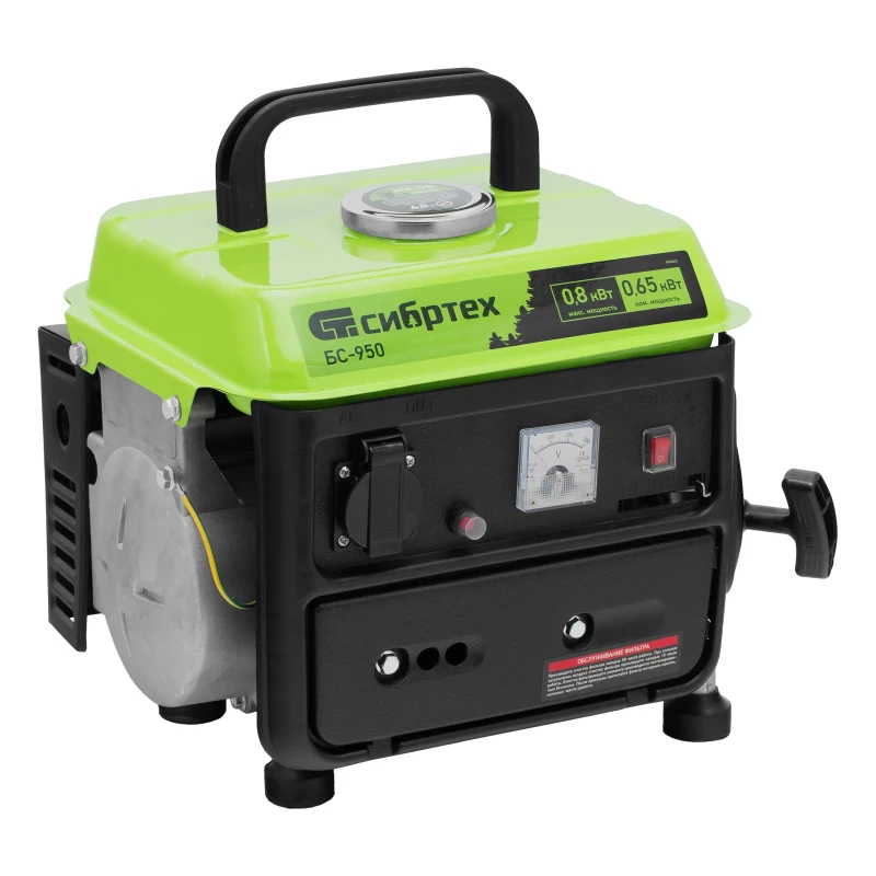 Купить инструмент Генератор бензиновый БС-950, 0.8 кВт, 230 В, 2-х тактный, 4 л, ручной стартер Сибртех в Кемерово по цене 7243 рублей. Смотрите другие 82 товаров в разделе Электростанции бензиновые по ценам от 7243 до 363390 рублей. Родительская категория - Силовое оборудование. Производитель - Сибртех.