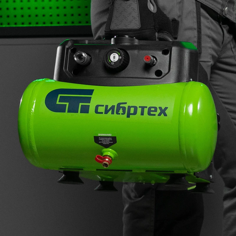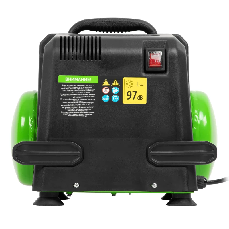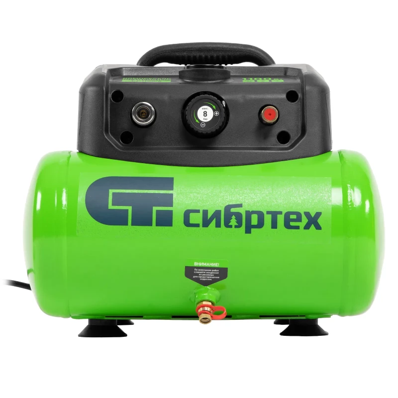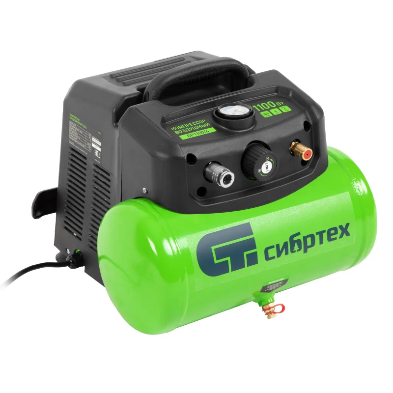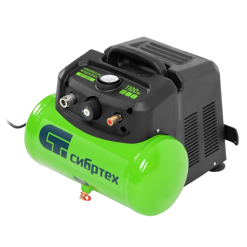 Воздушный безмасляный компрессор Сибртех BL 1100/6 58059 мощностью 1100 Вт, с ресивером емкостью 6 литров, служит для подачи сжатого воздуха под давлением до 8 бар со скоростью 180 л/мин. К нему можно подключить краскораспылитель, продувочный пистолет, заклепочник, пистолет для накачки шин и другой пневмоинструмент. Отсутствие масла делает компрессор оптимальным для выполнения покрасочных работ и продувки электронных компонентов. Устройство предназначено для бытового использования. Одна из основных особенностей данной модели — компактность и удобство в перевозке. Компрессор отличается небольшим весом и дополнен эргономичной транспортировочной ручкой. Преимущества: Автономность — прессостат обеспечивает автоматический запуск двигателя и его остановку в зависимости от уровня давления в ресивере. Простая подготовка к работе — быстроразъемный выходной коннектор «Рапид» (евро) позволяет легко подключить пневмоинструмент. Удобное управление — при помощи поворотного регулятора на передней панели можно установить нужное значение давления. Контроль давления в ресивере — в верхней части корпуса расположен манометр, для считывания показателей не нужно наклоняться. Предохранительный клапан — возможность сброса избыточного давления позволяет избежать аварийных ситуаций. Продуманная конструкция — виброгасящие опоры обеспечивают устойчивость компрессора во время работы.