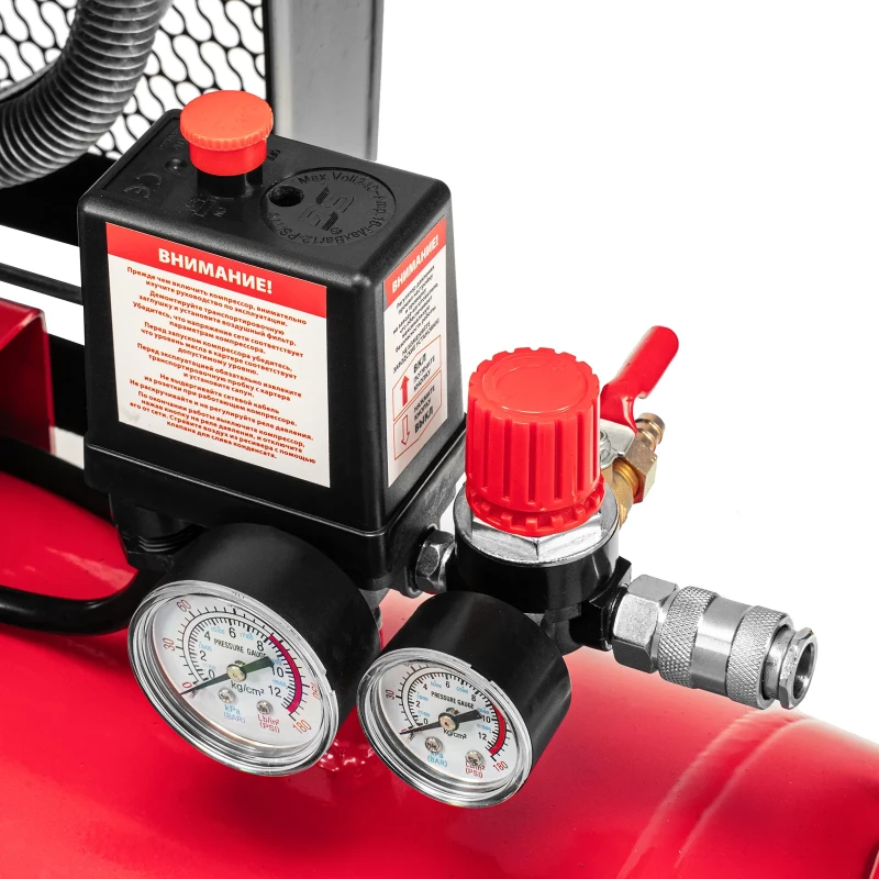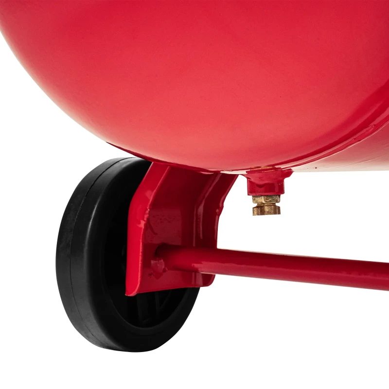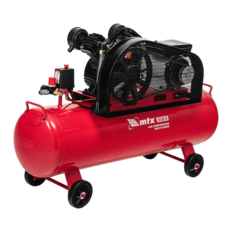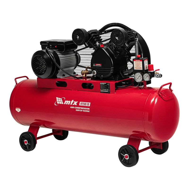 Компрессор воздушный МТХ КР2500/80 58022 с ременным приводом от электродвигателя, мощностью 2,5 кВт и производительностью 420 л/мин, с ресивером объемом 80 литров, применяется для подачи сжатого атмосферного воздуха к пневматическому инструменту. К нему можно подключить гайковерт, дрель, углошлифовальную машину, степлер, краскопульт, продувочный пистолет или другой пневмоинструмент. Для подключения предусмотрены 2 штуцера: быстросъемный и «елочка». Компрессор подходит для профессионального использования на предприятии автосервиса, строительной площадке, в мастерской. ПреимуществаТермозащита — при перегреве электропитание автоматически отключается, обмотки статора размыкаются, что позволяет сохранить ресурс двигателя. Защита от перегрузки — при превышении максимально допустимой величины тока компрессор отключается для предотвращения поломки. Безопасная эксплуатация — предохранительный клапан не допускает превышения максимально допустимого давления в ресивере. Автоматическая регулировка производительности — прессостат останавливает двигатель при достижении максимального рабочего давления (8 бар) и запускает его при падении давления ниже минимально допустимого уровня. Повышенный ресурс — блоки цилиндров из чугуна выдерживают длительную эксплуатацию, дополнительные ребра на них повышают эффективность охлаждения. Износостойкость — благодаря увеличенной емкости масляного картера все детали воздушного компрессора обеспечены достаточной смазкой. Удобный контроль давления в ресивере и пневмомагистрали — компрессор оснащен двумя механическими манометрами. Простая подготовка к работе — подключение пневмоинструмента к быстросъемному коннектору занимает несколько секунд. Мобильность — колеса и рукоятки облегчают перемещение компрессора по рабочей площадке. Готовность к работе — в комплект поставки входит сапун и компрессорное минеральное масло марки L-DAB 68 (250 мл).