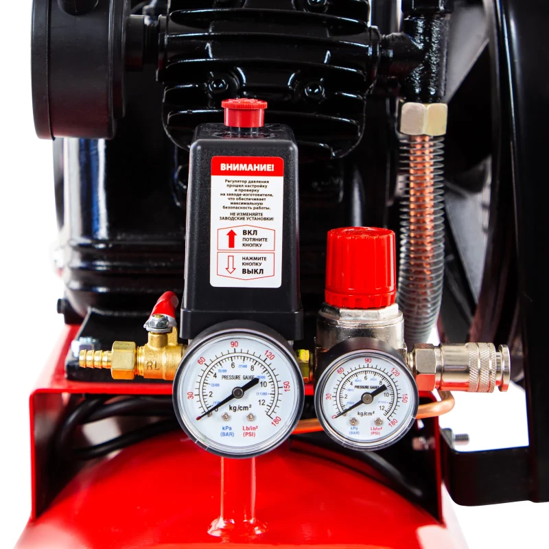 Компрессор воздушный МТХ КР3000/100 58023 с ременным приводом от электродвигателя, мощностью 3,0 кВт и производительностью 510 л/мин, с ресивером объемом 100 литров, применяется для подачи сжатого атмосферного воздуха к пневматическому инструменту. К нему можно подключить гайковерт, дрель, углошлифовальную машину, степлер, краскопульт, продувочный пистолет или другой пневмоинструмент. Для подключения предусмотрены 2 штуцера: быстросъемный и «елочка». Компрессор подходит для профессионального использования на предприятии автосервиса, строительной площадке, в мастерской. ПреимуществаТермозащита — при перегреве электропитание автоматически отключается, обмотки статора размыкаются, что позволяет сохранить ресурс двигателя. Защита от перегрузки — при превышении максимально допустимой величины тока компрессор отключается для предотвращения поломки. Безопасная эксплуатация — предохранительный клапан не допускает превышения максимально допустимого давления в ресивере. Автоматическая регулировка производительности — прессостат останавливает двигатель при достижении максимального рабочего давления (8 бар) и запускает его при падении давления ниже минимально допустимого уровня. Повышенный ресурс — блоки цилиндров из чугуна выдерживают длительную эксплуатацию, дополнительные ребра на них повышают эффективность охлаждения. Износостойкость — благодаря увеличенной емкости масляного картера все детали воздушного компрессора обеспечены достаточной смазкой. Удобный контроль давления в ресивере и пневмомагистрали — компрессор оснащен двумя механическими манометрами. Простая подготовка к работе — подключение пневмоинструмента к быстросъемному коннектору занимает несколько секунд. Мобильность — колеса и рукоятки облегчают перемещение компрессора по рабочей площадке. Готовность к работе — в комплект поставки входит сапун и компрессорное минеральное масло марки L-DAB 68 (250 мл).