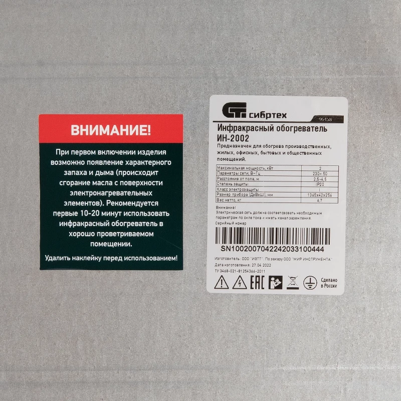 Инфракрасный обогреватель Сибртех ИН-2002 96458 подключается к сети 230 В, потребляет мощность до 2000 Вт и предназначен для создания комфортных температурных условий в помещении в холодное время года. Служит основным источником тепла на площади до 20 кв. м и дополнительным — в помещениях до 40 кв. м.