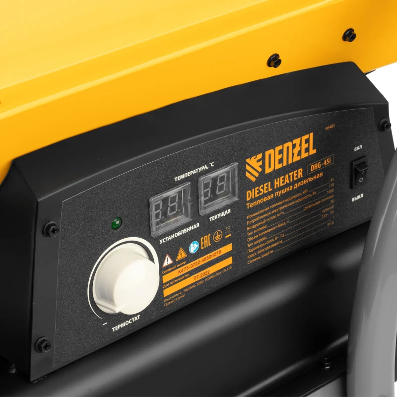 - Наименование Дизельная тепловая пушка DHG-45i, 45 кВт, 1000 м3/ч, прямой нагрев, электронный термостат Denzel